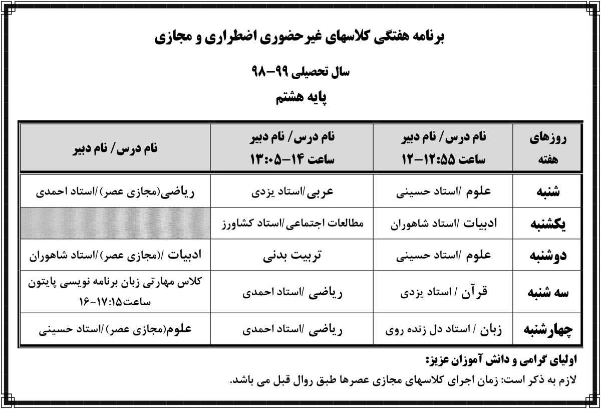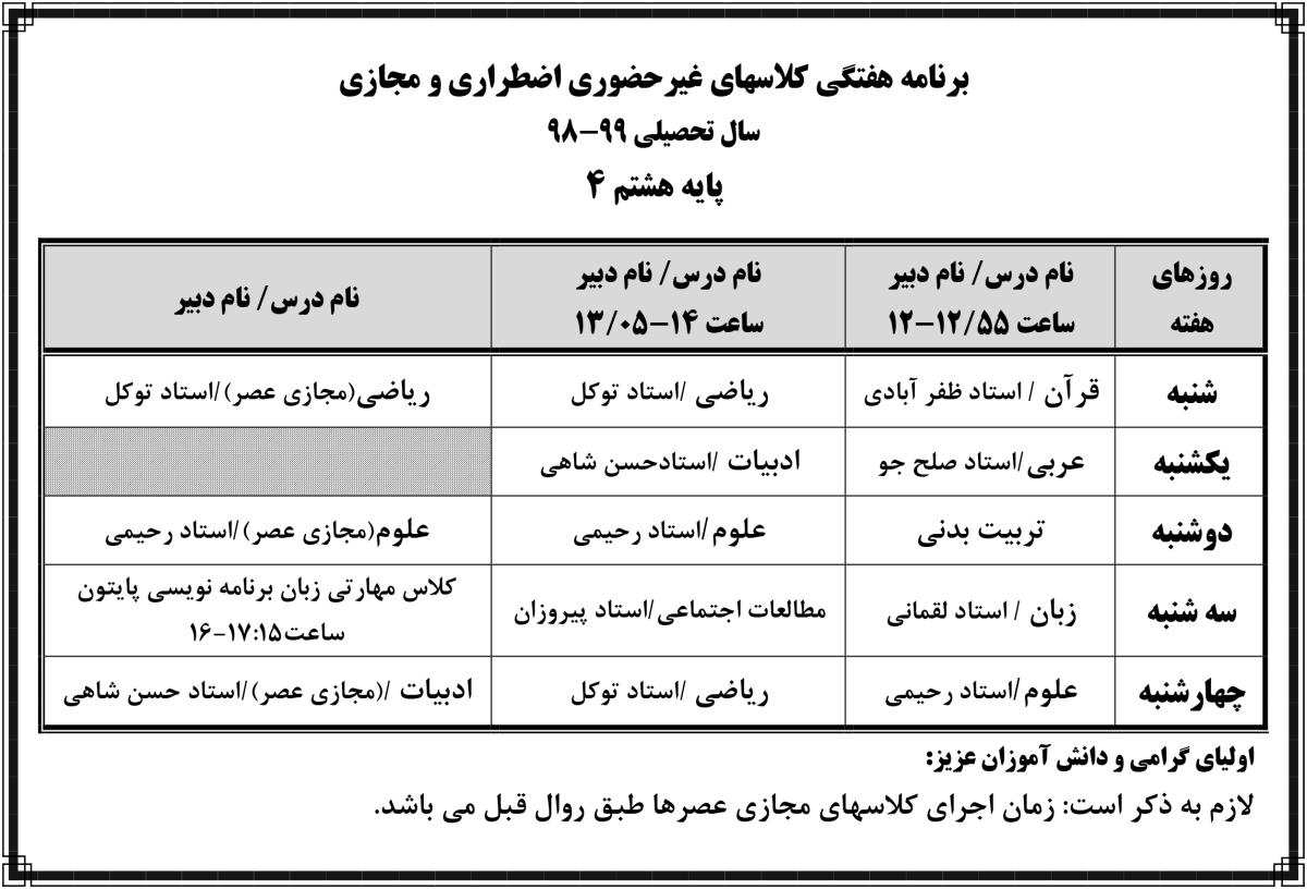 پایه هشتم4-برنامه هفتگی کلاسهای غیرحضوری اضطراری و مجازی