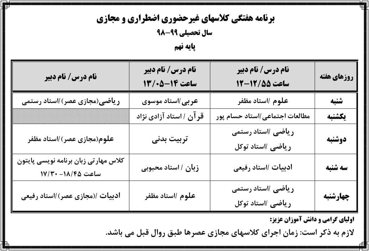 پایه نهم -برنامه هفتگی کلاسهای غیرحضوری اضطراری و مجازی