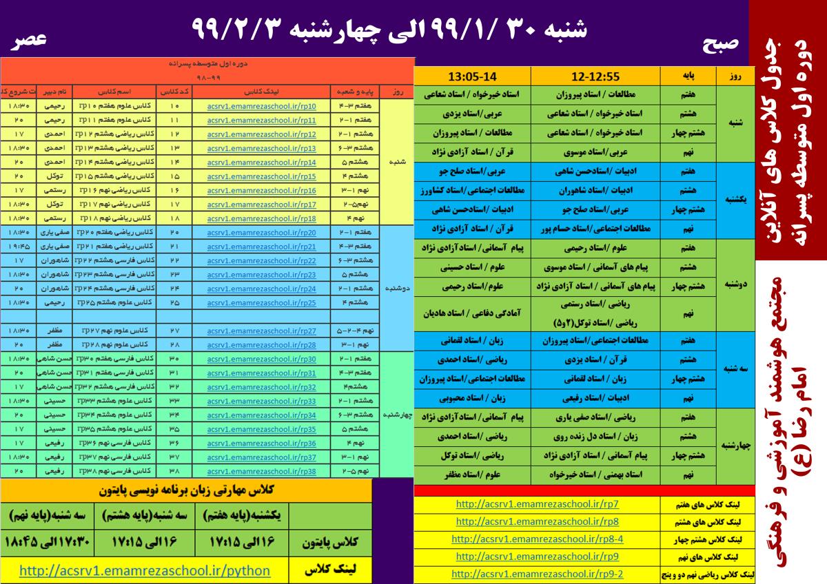 جدول کلاس های آنلاین شنبه 30 فروردین الی چهارشنبه 3 اردیبهشت 1399