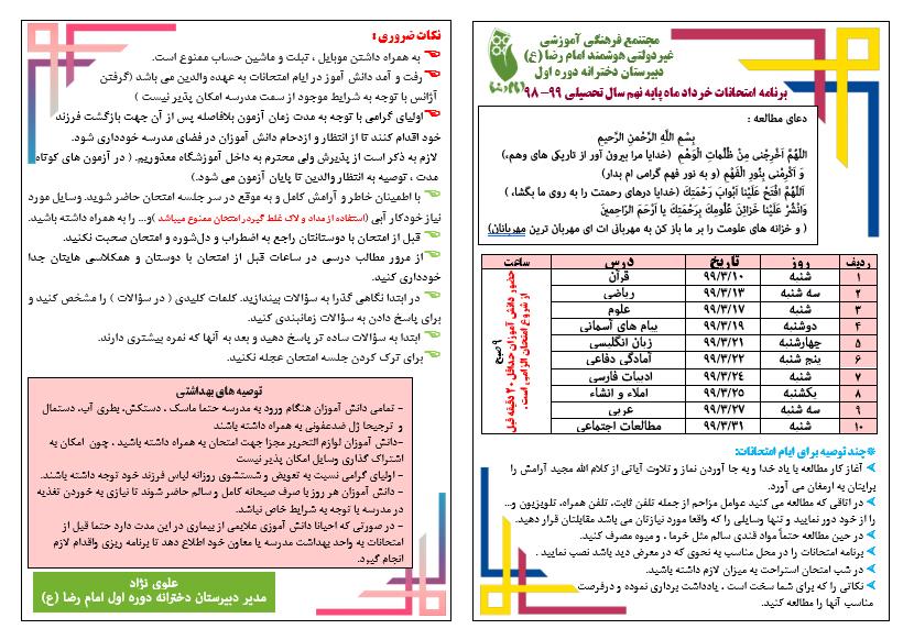 برنامه امتحان پایانی پایه نهم