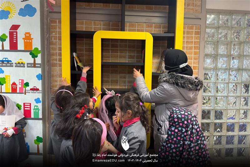 کتابخانه کودکستان در راهرو قرار گرفته و فضایی جذاب برای کودکان فراهم کرده است تا در زنگ تفریح از آن استفاده کنند. بچهها میتوانند به راحتی به کتابها دسترسی داشته باشند و در این محیط دوستانه و آرام به خواندن کتابهای مناسب سن خود بپردازند. این کتابخانه در کنار مسیر عبور کودکان، محیطی ساده و دلپذیر برای تشویق آنها به مطالعه و کشف دنیای داستانها و آموزشهای جدید فراهم میکند. علاوه بر کتاب، بخشهای مختلفی مانند کتابهای تصویری، بازیهای آموزشی، و گوشههای داستانگویی نیز فراهم شده تا کودکان از طریق فعالیتهای جذاب و سرگرمکننده با دنیای کتابها آشنا شوند و تخیل خود را پرورش دهند. این فضا به کودکان کمک میکند که عشق به کتاب و یادگیری را از سنین پایین تجربه کنند.