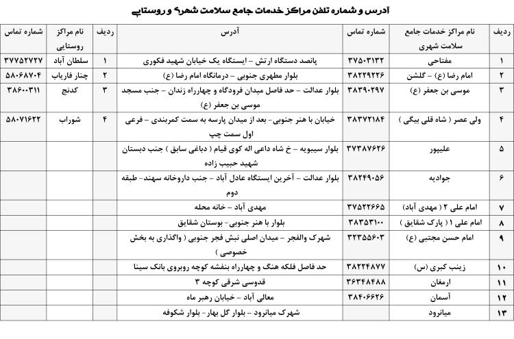 آدرس و شماره تلفن مراکز خدمات جامع سلامت شهری و روستایی