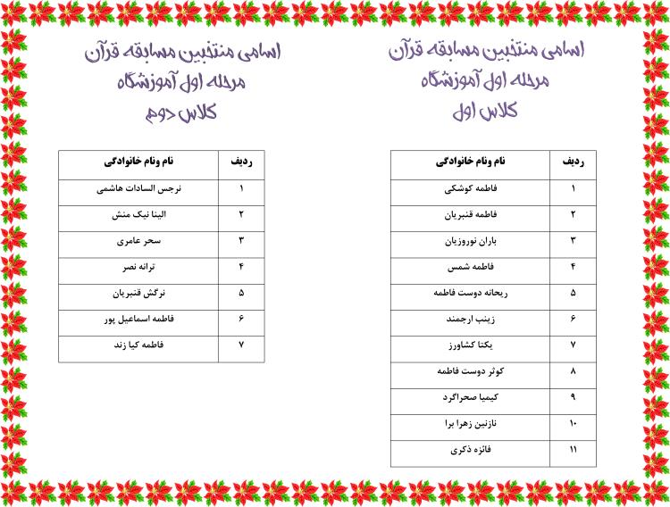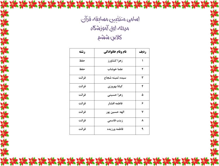 احترام اسامی منتخبین مسابقات قرآن مرحله اول آموزشگاه اعلام می گردد.