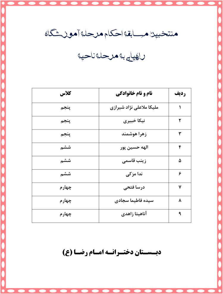 اسامی منتخبین مسابقه احکام ( راه یابی به ناحیه )
