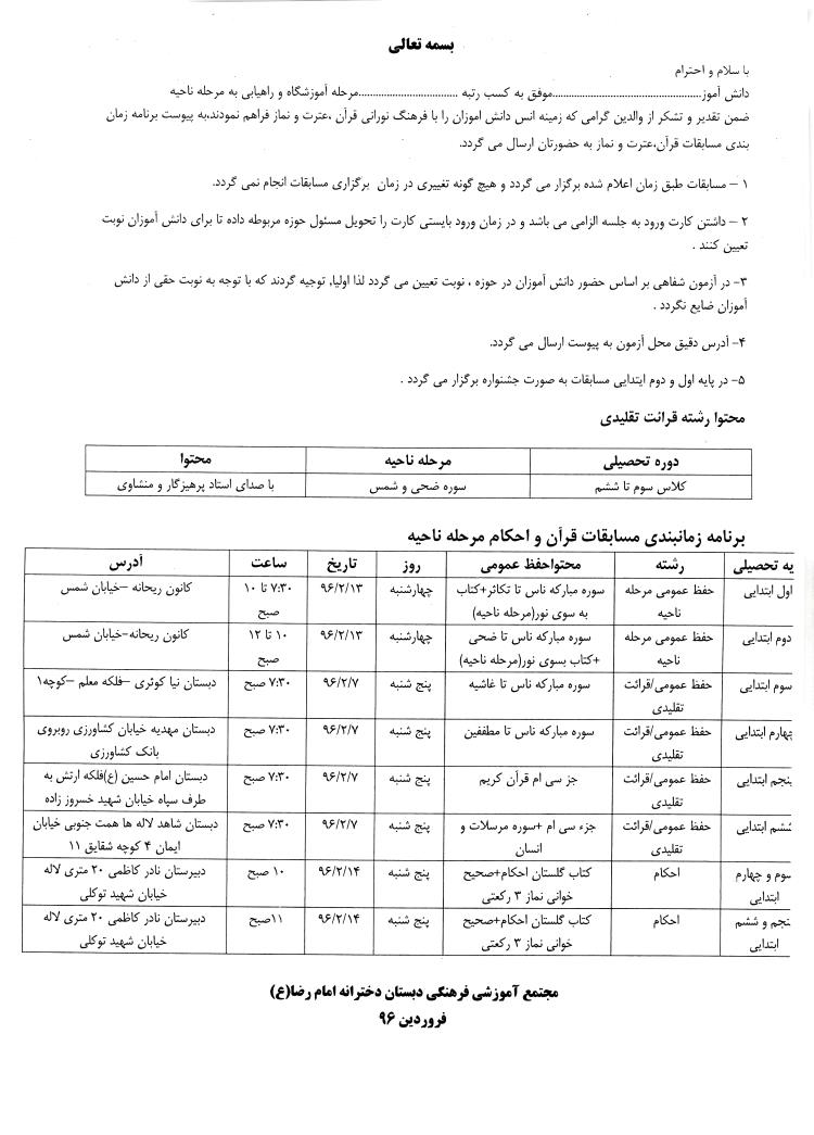 برنامه زمان بندی مسابقات قرآن ، عترت و نماز مرحله ناحیه