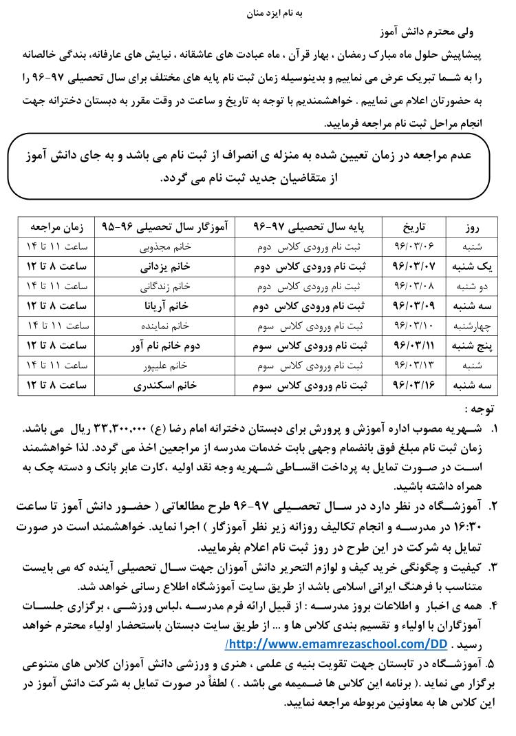 اطلاعیه : زمان ثبت نام پایه های اول ، دوم و سوم