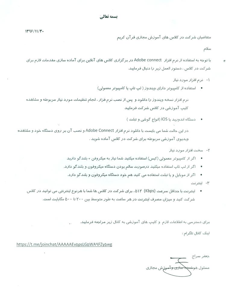 به اطلاع می رساند با توجه به تصویب برگزاری کلاس های مجازی آموزش قرآن کریم ویژه والدین مفاد و شرایط مورد نیاز جهت شرکت در کلاس ها حضورتان اعلام می گردد.
