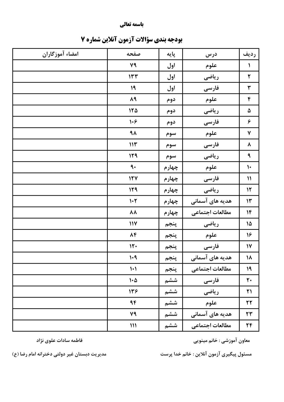 بودجه بندی آزمون آنلاین شماره 7 (30 و 31 فروردین ماه)