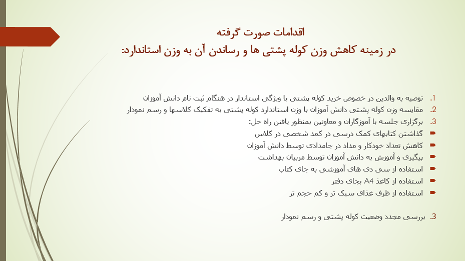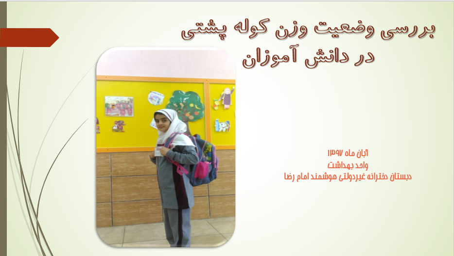 همانگونه که مستحضر هستید، کوله پشتی دانش آموز یکی از دغدغه های والدین و اولیای مدارس است، چرا که دانش اموزان تقریبا ۹ ماه از سال را هر روز کوله پشتی خود را حمل می کنند و اگر این کوله پشتی مناسب نباشد یا وزن ایده آل نداشته باشد می تواند بسیار مشکل ساز شود چرا که دانش آموزان مخصوصا در سنین ابتدایی، در حال رشد هستند و عدم دقت در انتخاب و حمل درست کوله پشتی می تواند به رشد اسکلتی آنان آسیب برساند. به همین منظور در دبستان دخترانه امام رضا (ع) وضعیت وزن کوله پشتی ها به تفکیک کلاسها بررسی گردید و با توجه به نداشتن وزن استاندارد پس از جلسات متعدد با آموزگاران و ارائه آموزشهای لازم به دانش آموزان و همکاری معاونین محترم با واحد بهداشت این مشکل مرتف گردید. در ذیل تصاویر مربوط آورده شده است.