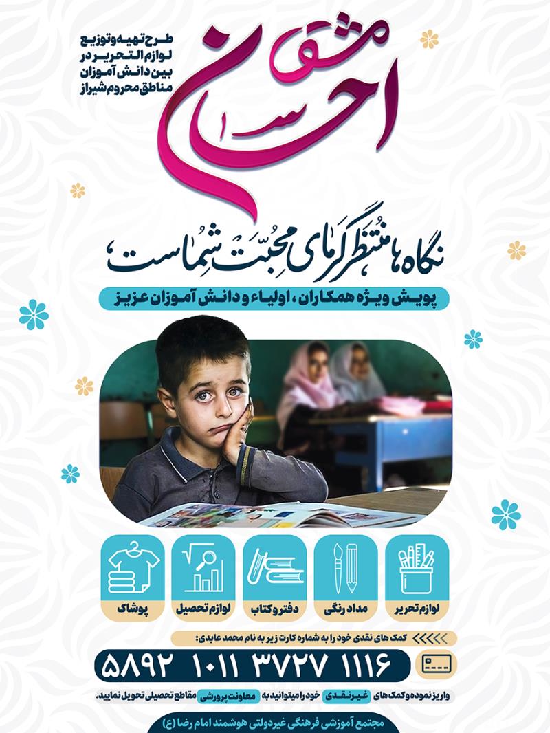 مشق احسان طرح تهیه و تولید لوازم التحریر در بین دانش آموزان مـناطق محروم شیراز
