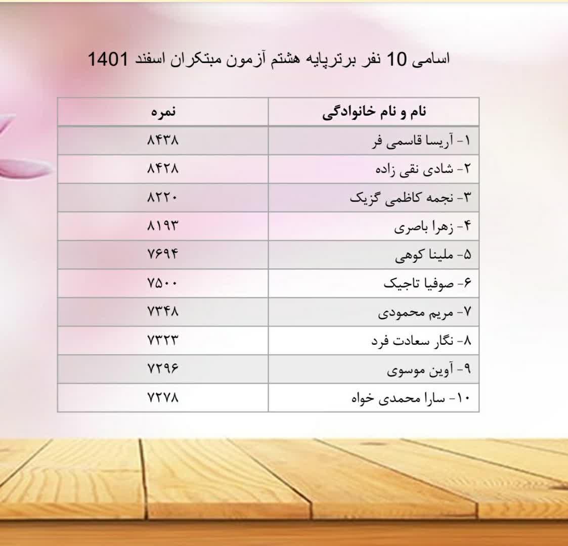 نفرات برتر آزمون مبتکزان مورخ ۱۰ اسفند ماه ۱۴۰۱ پایه هشتم🌺🌺