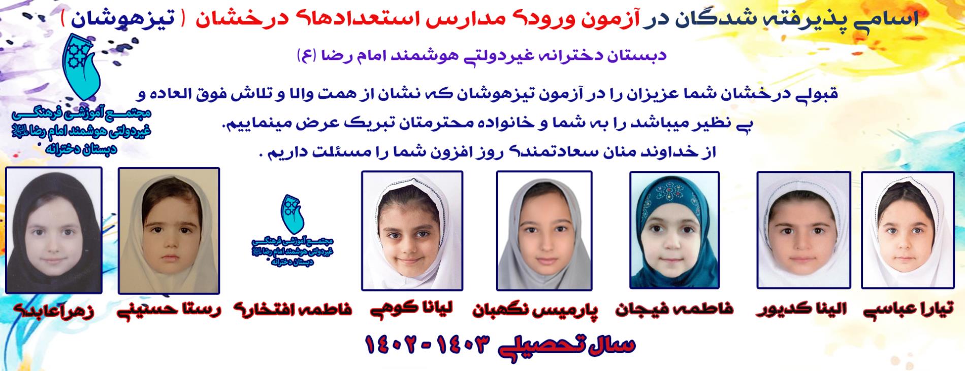 قبولی درخشان شما عزیزان را در آزمون تیزهوشان که نشان از همت والا و تلاش فوق العاده و بی نظیر میباشد را به شما و خانواده محترمتان تبریک عرض مینماییم. از خداوند منان سعادتمندی روز افزون شما را مسئلت داریم .