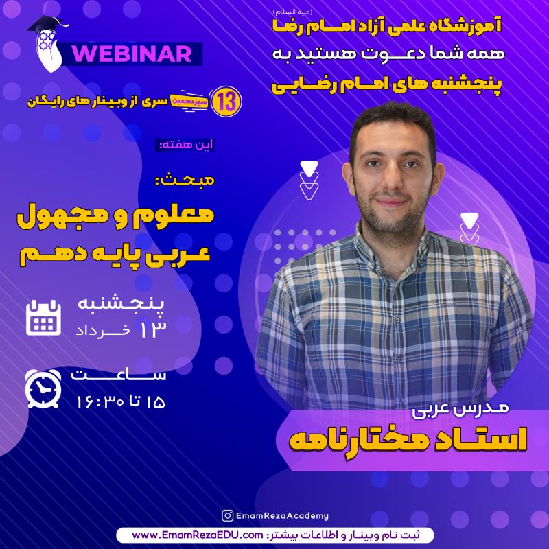 وبینار عربی با مبحث معلوم مجهول پایه دهم برگزار می گردد
