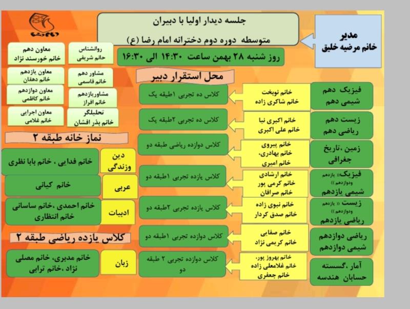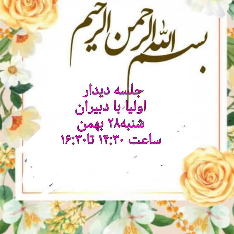 برگزاری جلسه دیدار اولیا و دبیران 18 آبان ها در پایه دهم و یازدهم در فضای باز مجتمع دخترانه برگزار خواهد شد.